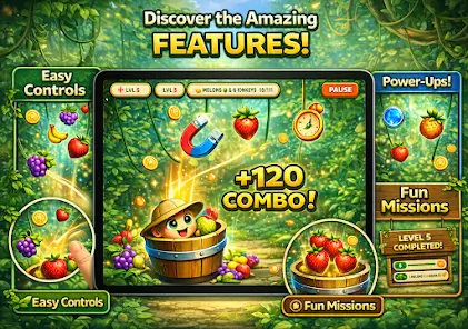 《水果丛林》的设计灵感来源于生机勃勃的热带雨林。游戏背景中可以看到高大的棕榈树、茂密的藤蔓以及阳光透过树叶形成的光影效果,让整个画面显得充满自然气息。